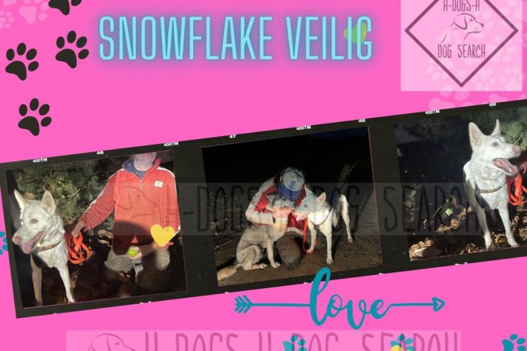 Vanmorgen vroeg werden we benaderd om te helpen bij de vermissing van Snowflake.Snowflake was s ’morgens vanaf 7 uur vermist vanaf het wedstrijd terrein bij de Hoogeloonsedijk. Eenmaal aangekomen met Bram, Cooper en Boef van Esther Lindeman – van Dingenen kregen we te horen dan Snowflake ergens het bos in was gegaan en in blinde…